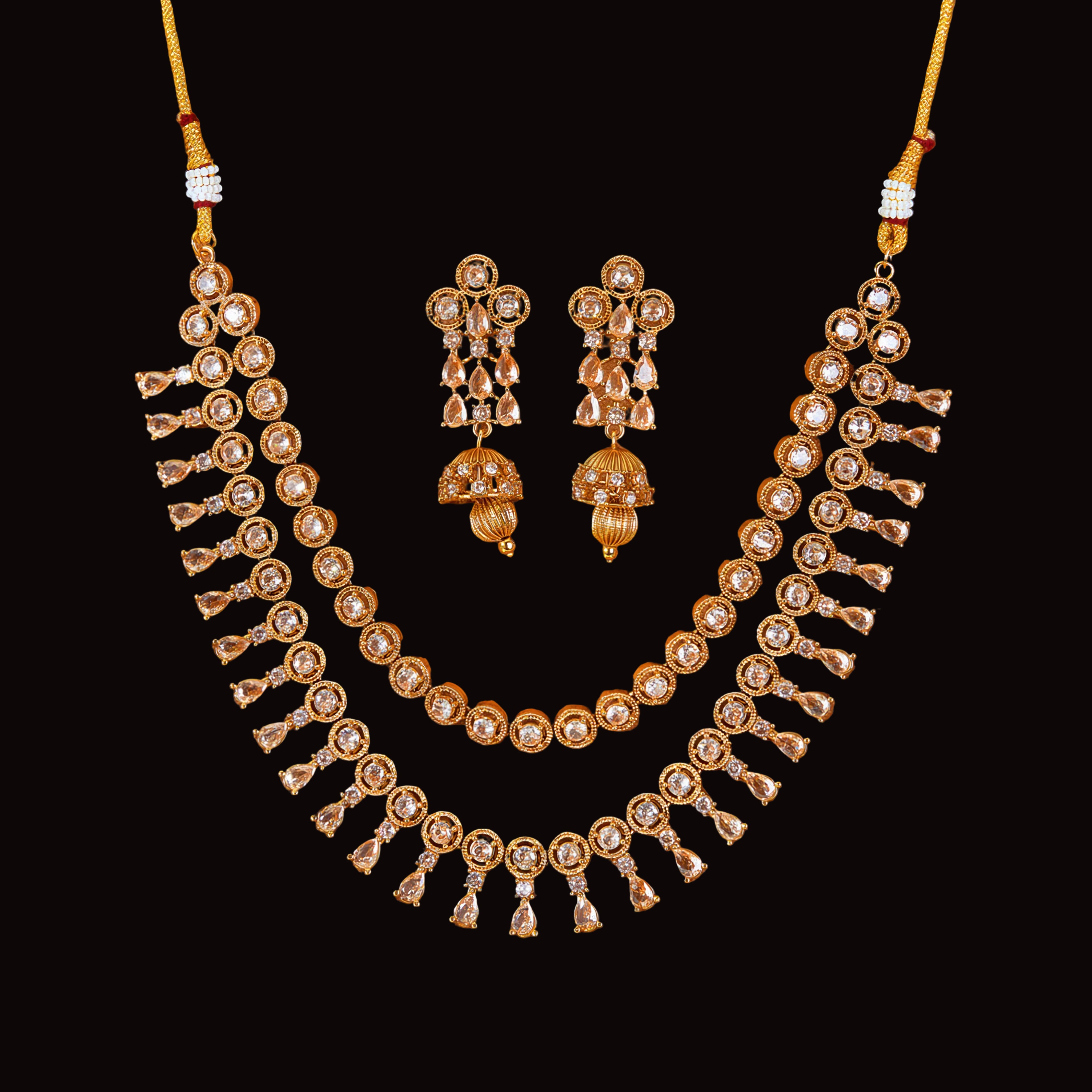 Celebrate timeless tradition with this exquisite antique necklace set crafted in rich Mehndi plating. Designed with classic circular motifs and elegant teardrop danglers, this necklace reflects old-world charm with intricate detailing. The warm antique finish beautifully enhances the sparkle of the stones, giving the set a regal and heritage-inspired look.