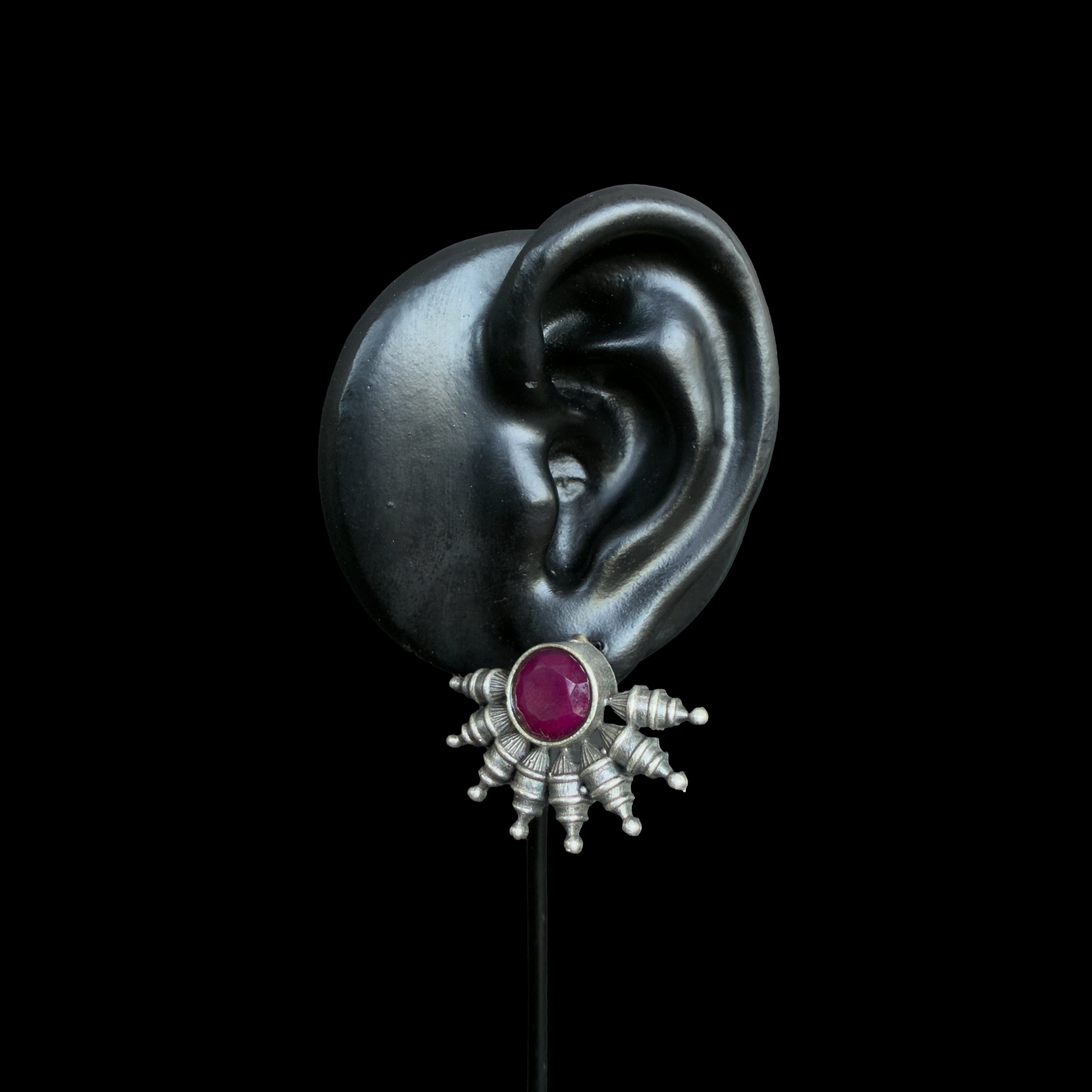 Elevate your jewellery collection with these exquisite oxidized silver stud earrings, featuring a bold ruby-red stone at the center. Inspired by vintage temple jewellery, these earrings blend ethnic charm with modern versatility. Perfect for women who love bold yet elegant statement pieces.