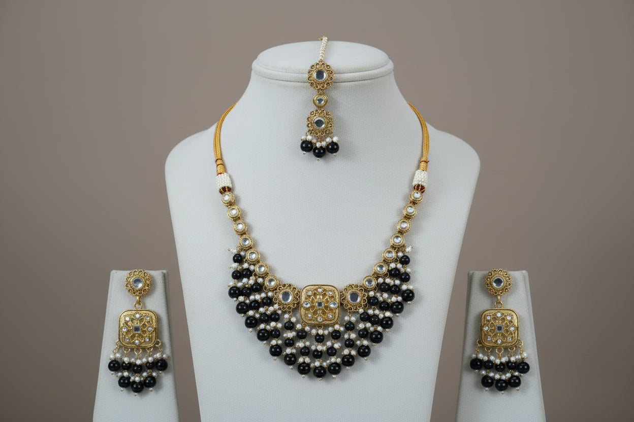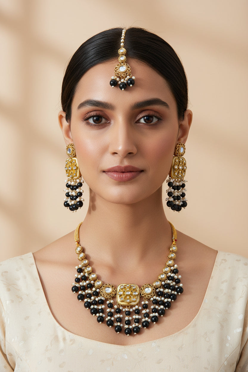 Kundan style & Black Pearl Bridal Necklace Set, a masterpiece of traditional craftsmanship and modern regal aesthetics. This set features intricately embedded uncut kundan stones, surrounded by gold-plated filigree work and complemented by luxurious layers of cascading black pearls.