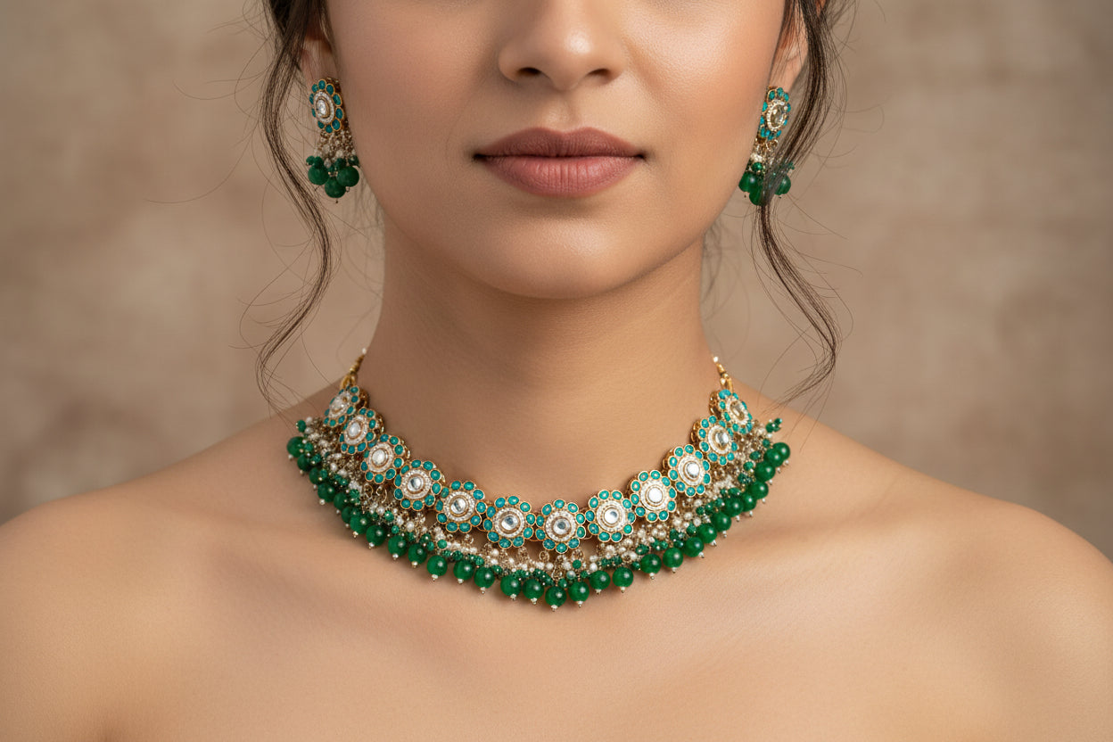 ✔ Dazzling pearls & semi-precious green beads – Offering a regal appeal.