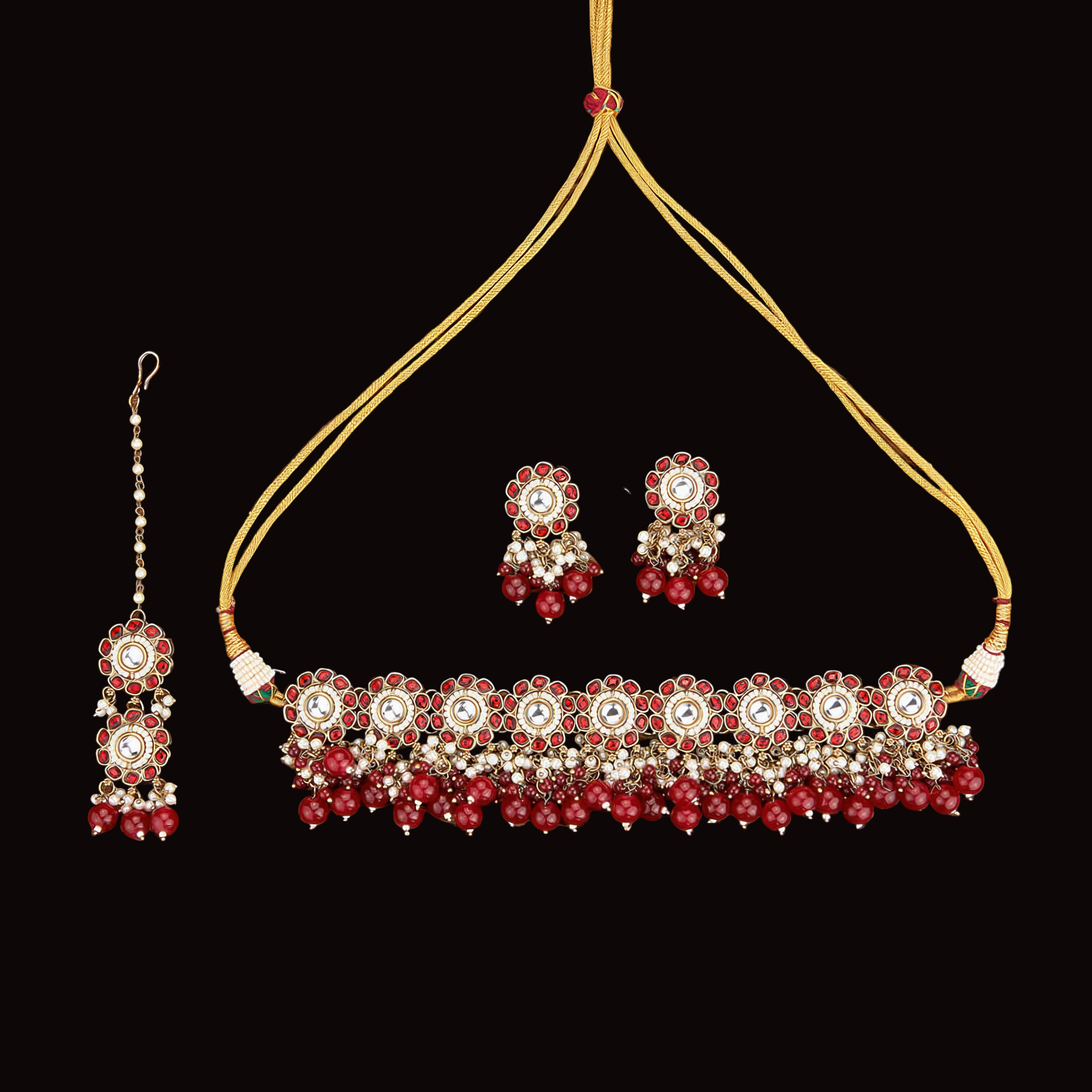 Handcrafted Kundan & Ruby Beaded Bridal Necklace Set, a luxurious statement piece inspired by traditional Rajasthani & Mughal jewellery. The set includes a choker-style necklace, chandelier earrings, and a matching maang tikka, each adorned with gold-plated circular Kundan motifs, encrusted with mirror-polished stones and surrounded by intricate Meenakari detailing.