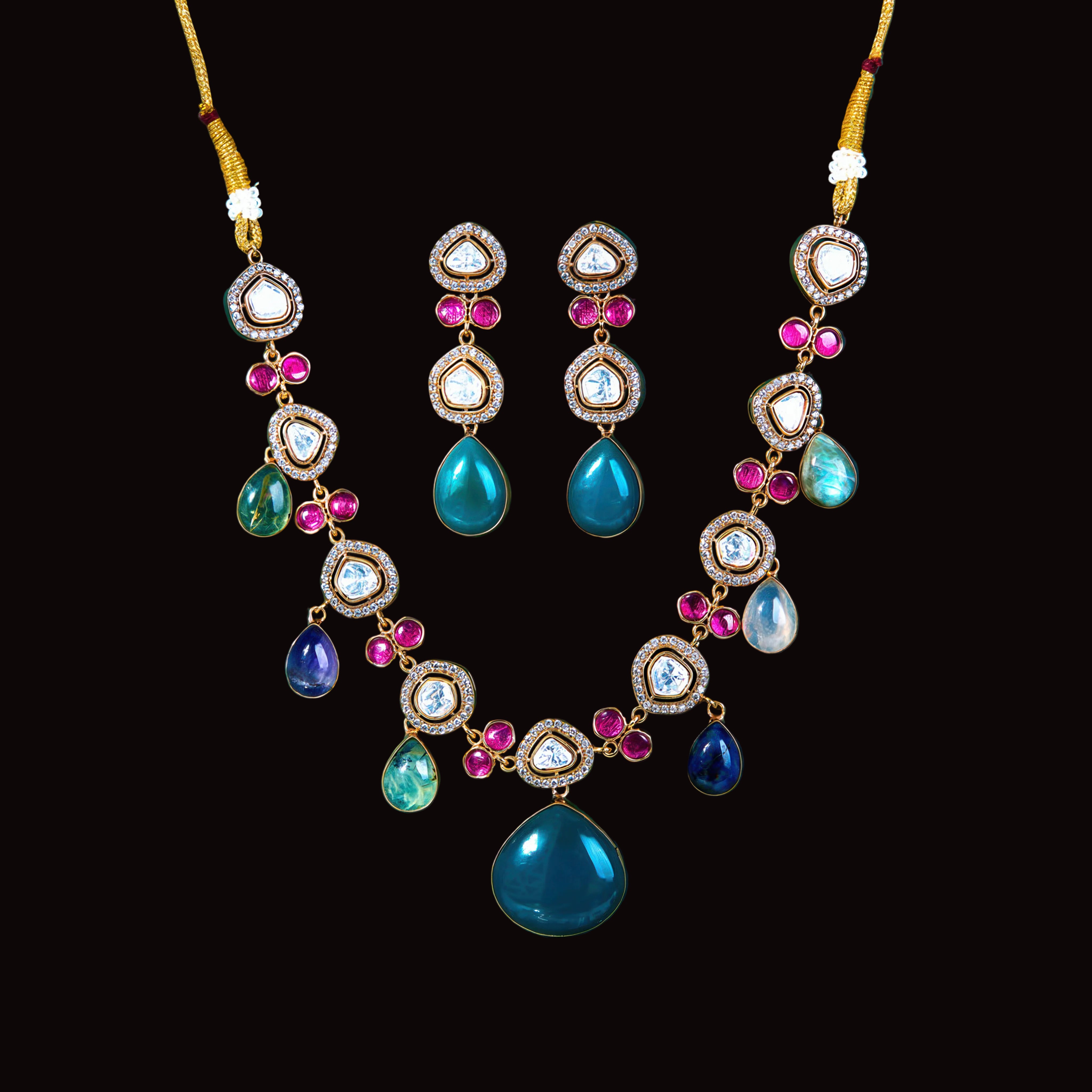 Indulge in timeless elegance with this exquisite Kundan and green stone necklace set, featuring an ornate choker-style necklace paired with matching drop earrings. The delicate blend of sparkling Kundan, radiant pink stones, and teardrop gemstones makes this set a statement piece, perfect for grand occasions.