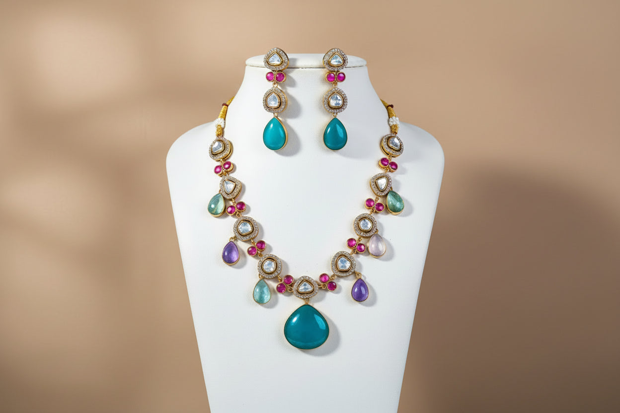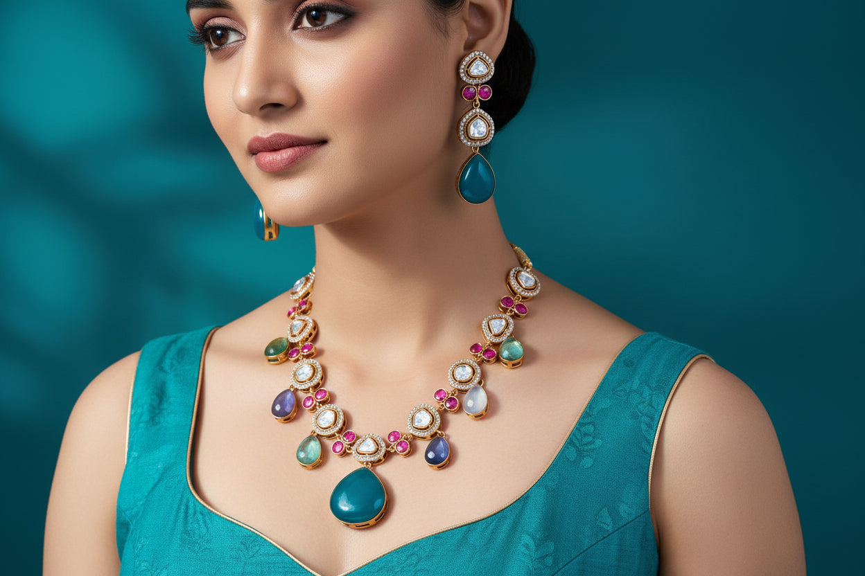 💡 Style Tip: Pair this set with a silk saree, lehenga, or an embellished gown for a majestic look. Add a golden clutch and bangles for the perfect finishing touch!