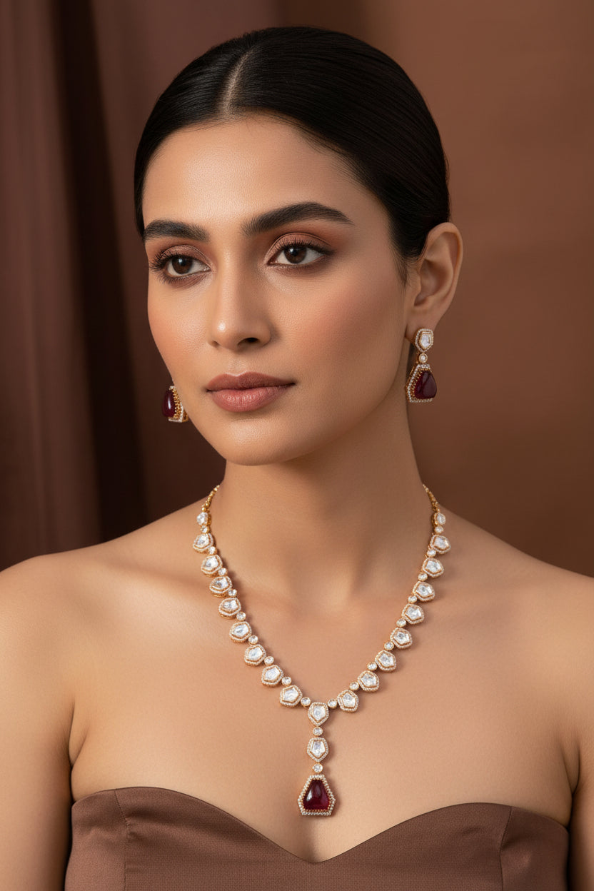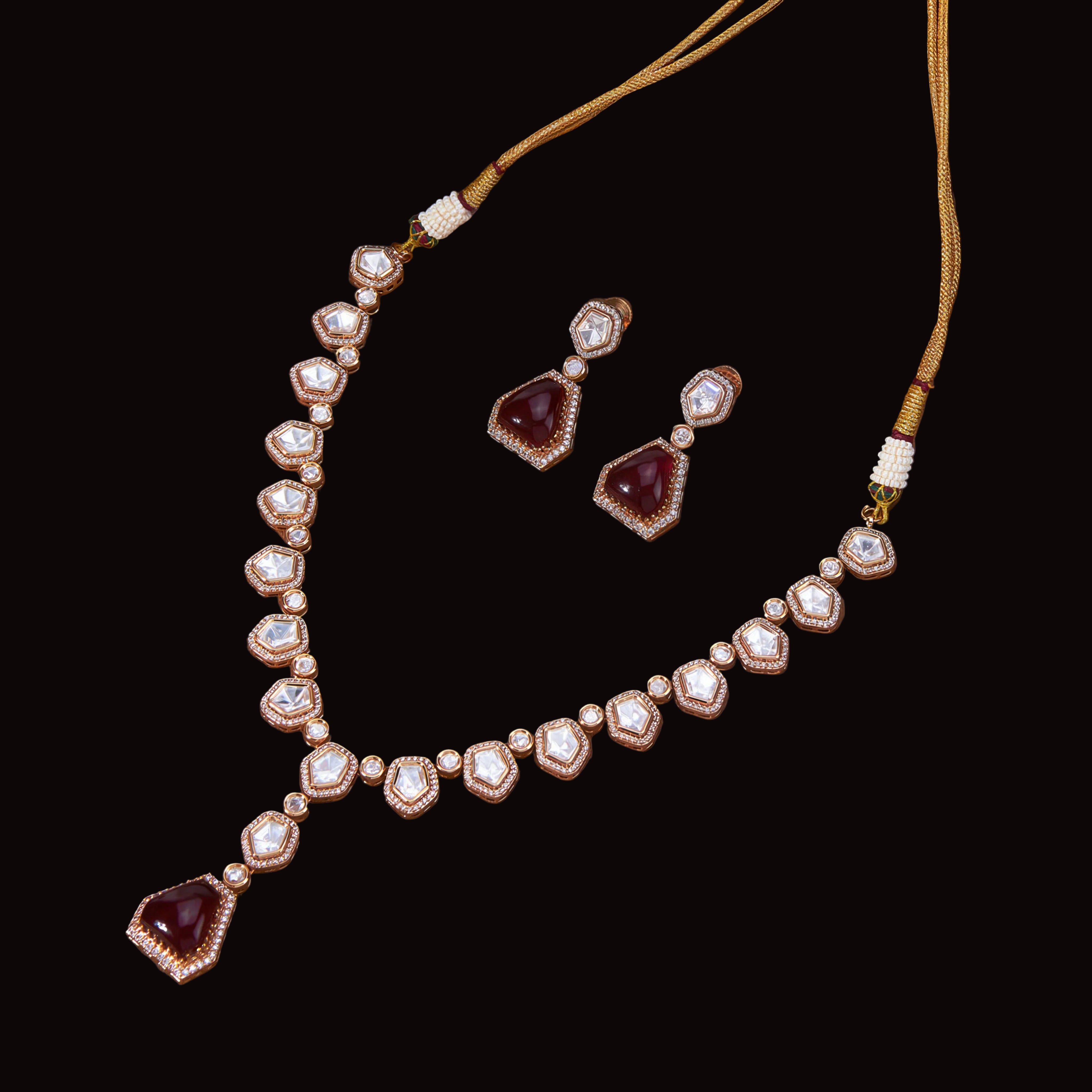 Rose. Gold Plated Kundan Necklace (Bridal & Party Wear) Add a touch of grandeur to your jewellery collection with our Gold Plated Ruby & Necklace. Designed to captivate, this stunning piece features vibrant red stones intricately set in a gold-plated framework, making it the perfect accessory for bridal wear and grand celebrations.