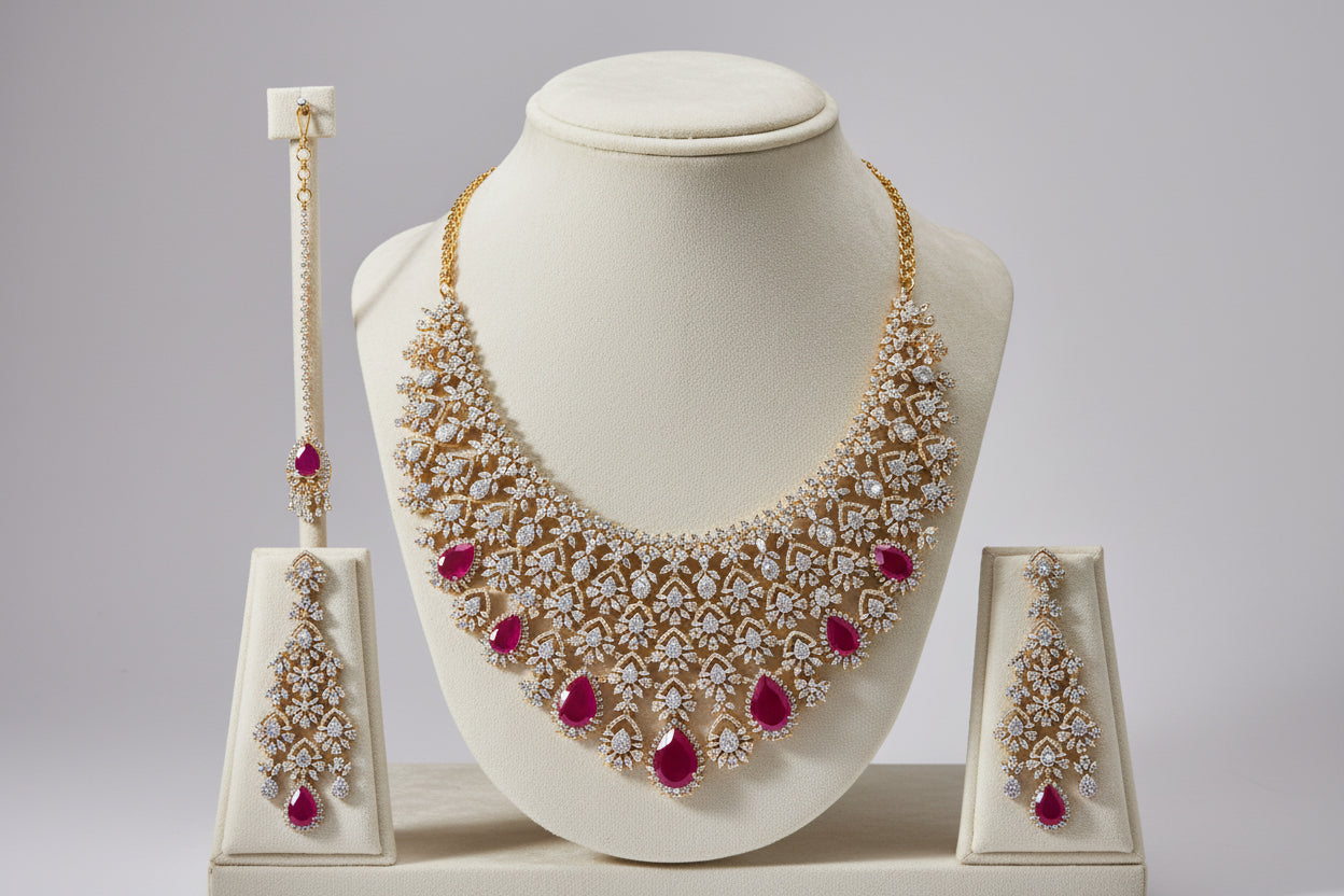 Royal Ruby & Diamond Bridal Necklace Set, a masterpiece of luxury and craftsmanship. This set is designed to exude grandeur, featuring brilliant-cut diamonds intricately arranged around deep red pear-cut rubies, creating a majestic and sophisticated look.