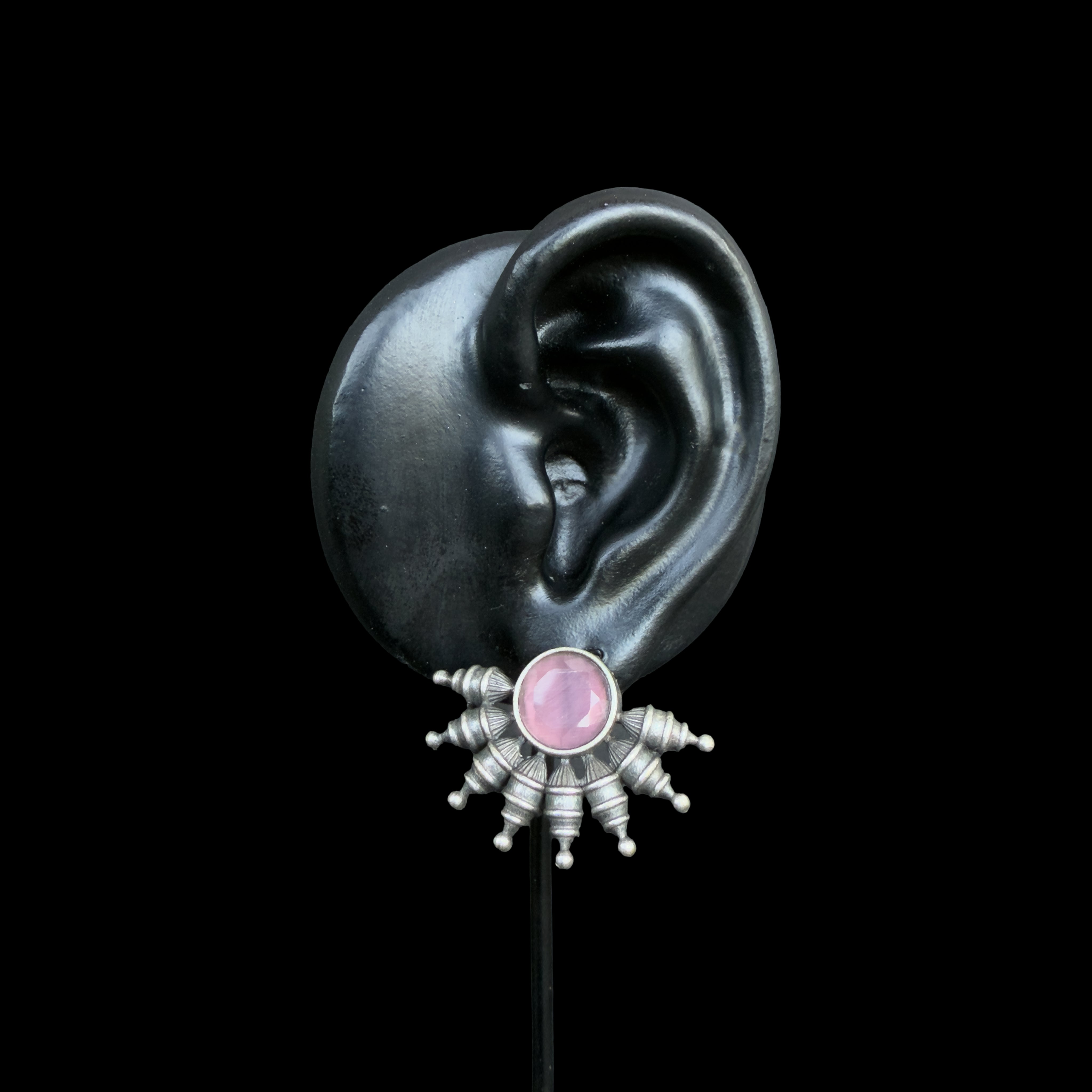 Oxidised Silver Tribal Stud Earrings with Pink Stone Center