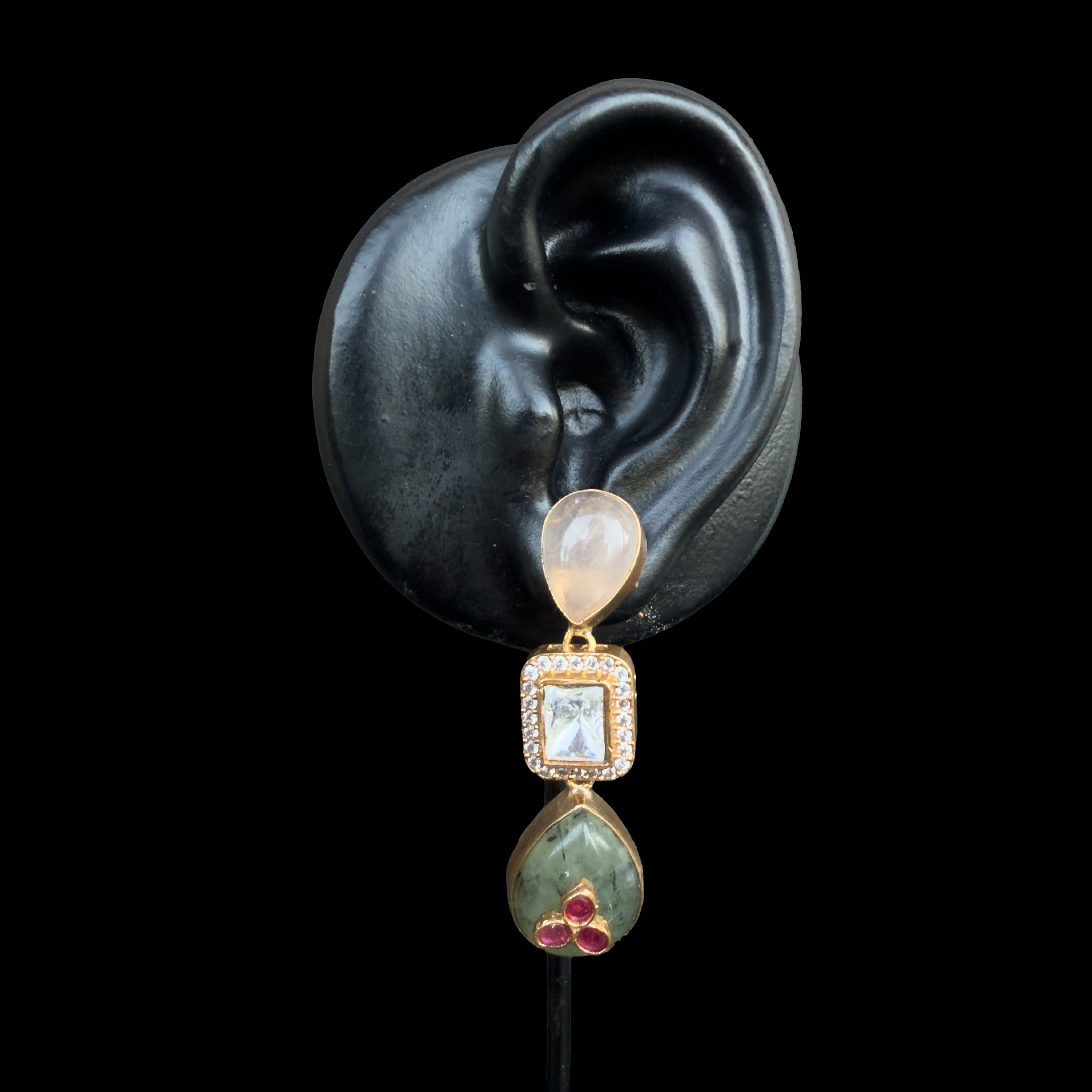 Mint Pink Kundan Earrings with Semi-Precious Rose Quartz, Jade Drops & Ruby Floral Motif